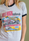 Super rad and rare Vintage 1984 NHRA Mile High Nationals Denver, ringer tee. Heather grey with black neck and sleeve trim. 1984 NHRA copyright.