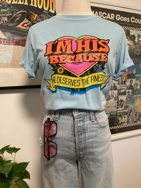 Funny 1973 "I'm His Because He Deserves the Finest" tee. Copyright Roash 1973 graphics on the front. Blank back. Unisex fit. Single stitch.