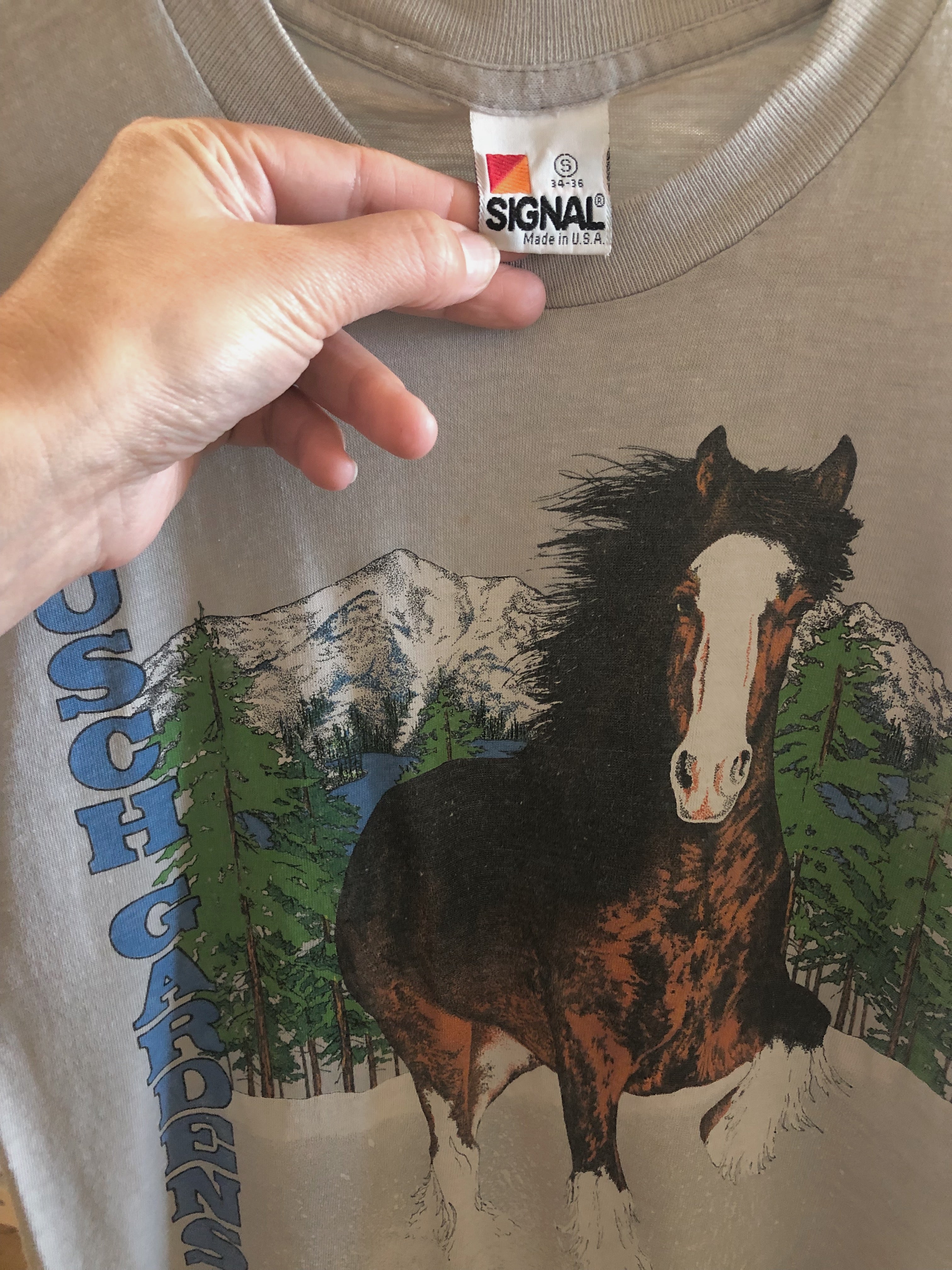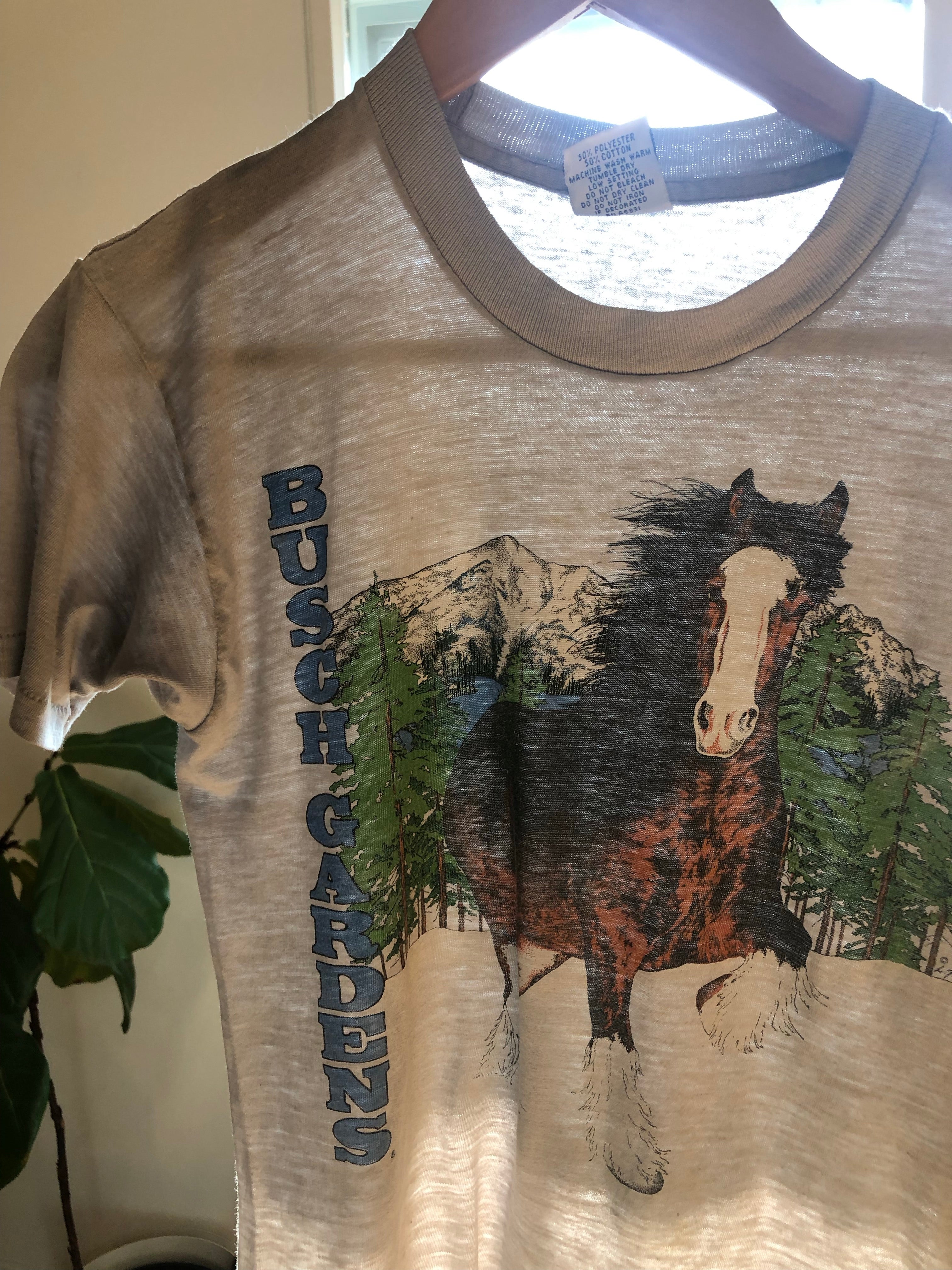 Rare vintage 1980s soft and thin Busch Gardens tee with perfectly faded iconic Clydesdale horse and mountain scene graphic. Light grey, unisex fit, single stitch tee. L Tibbs artist copyright design.