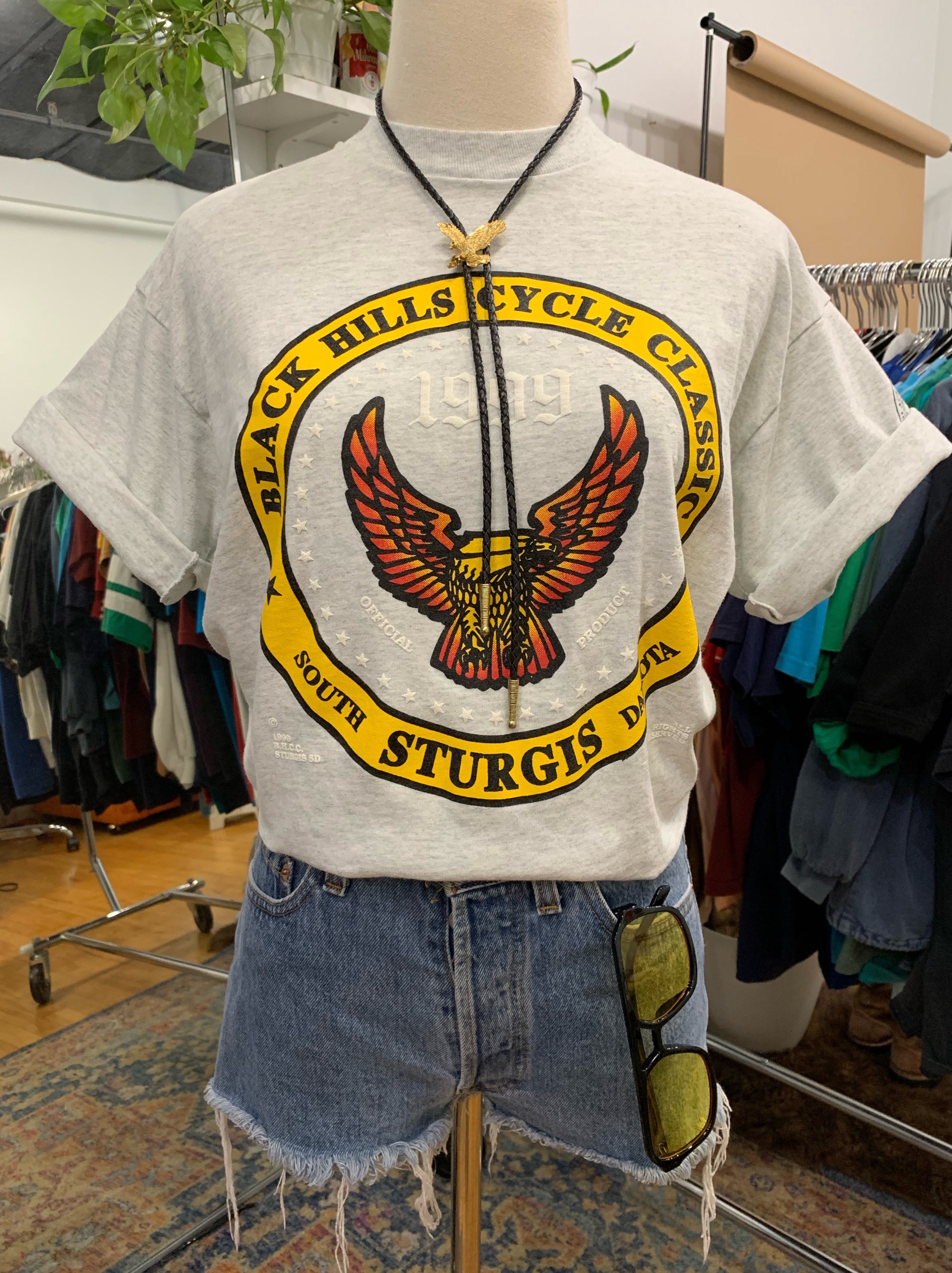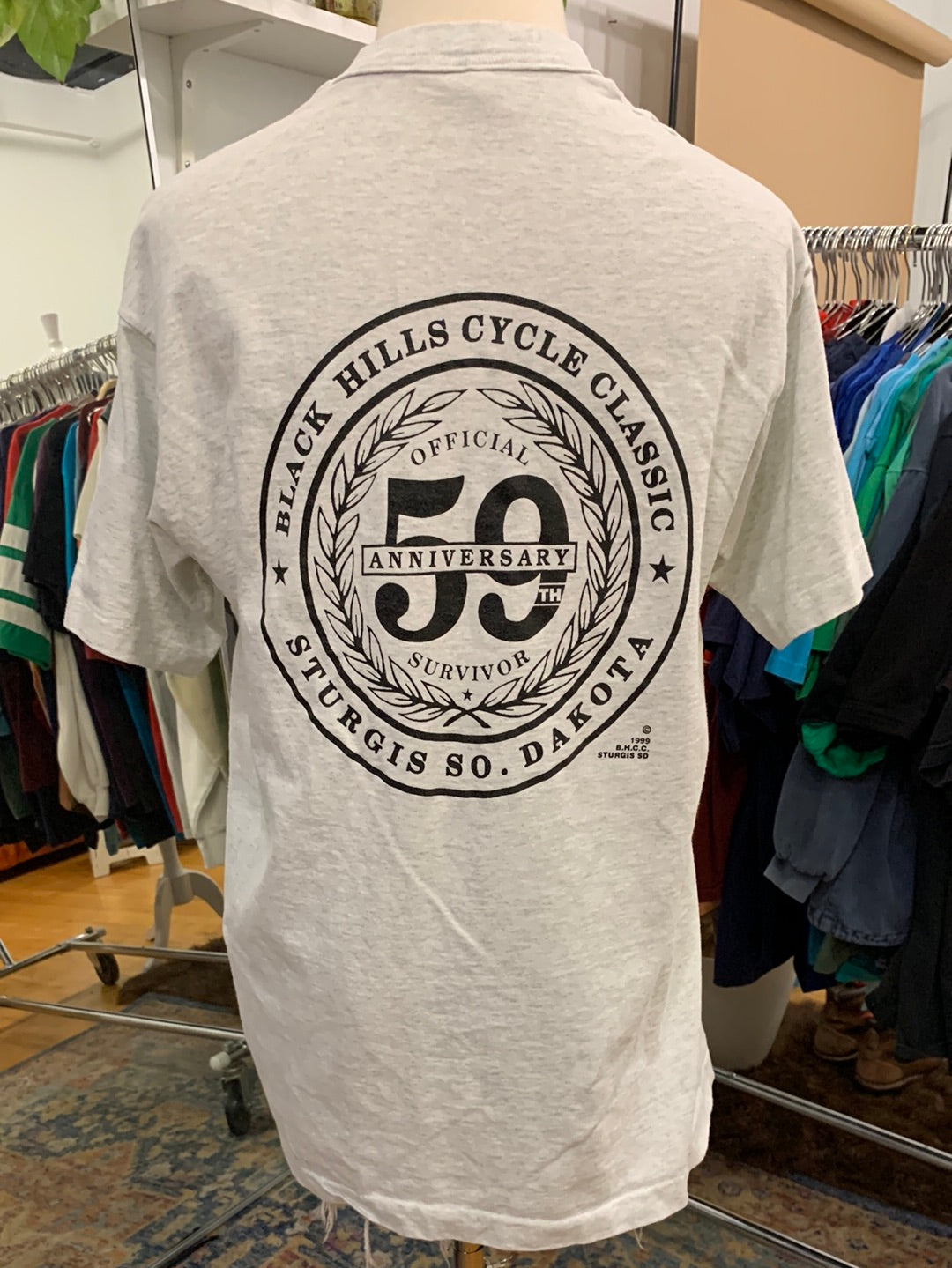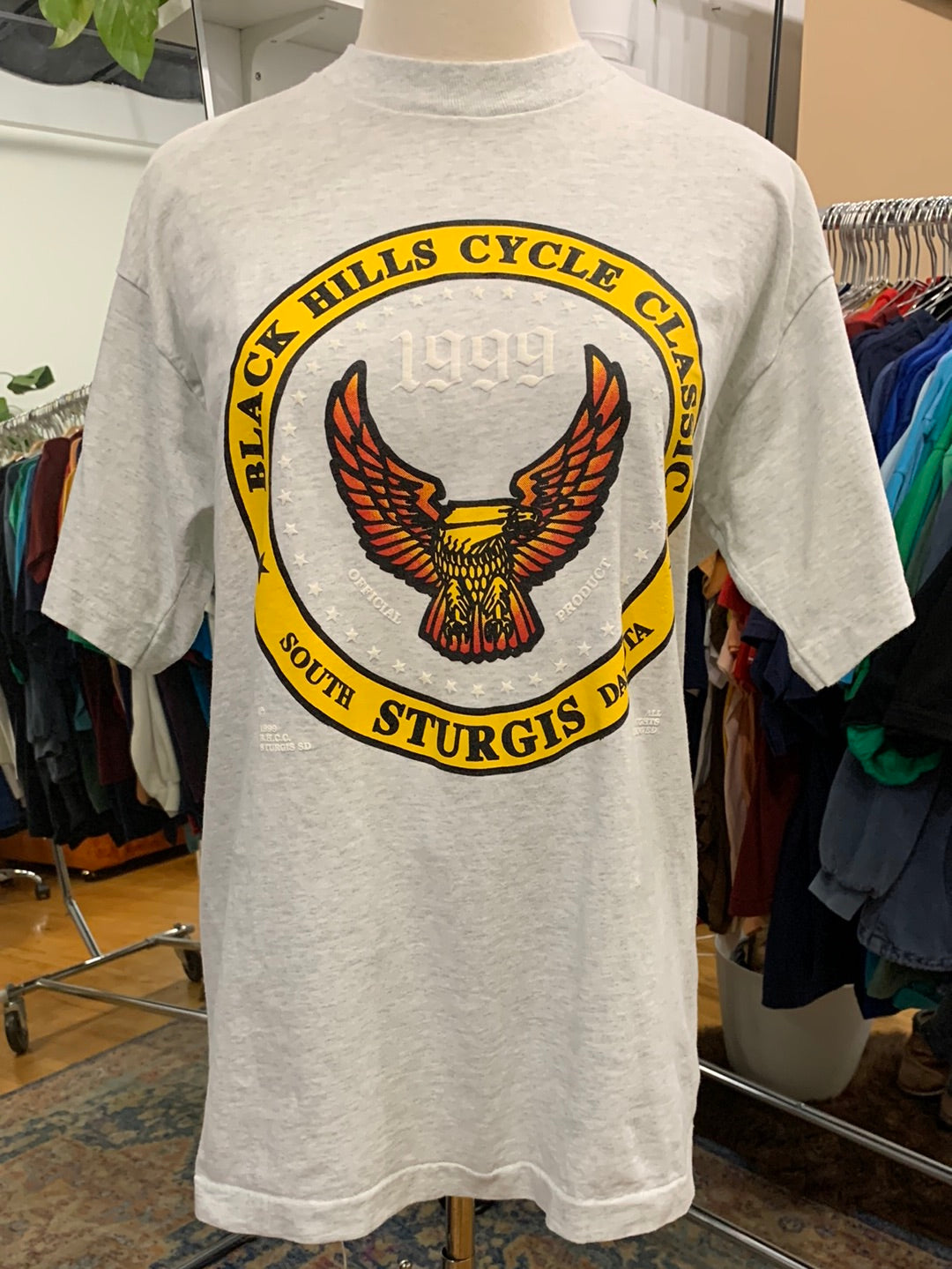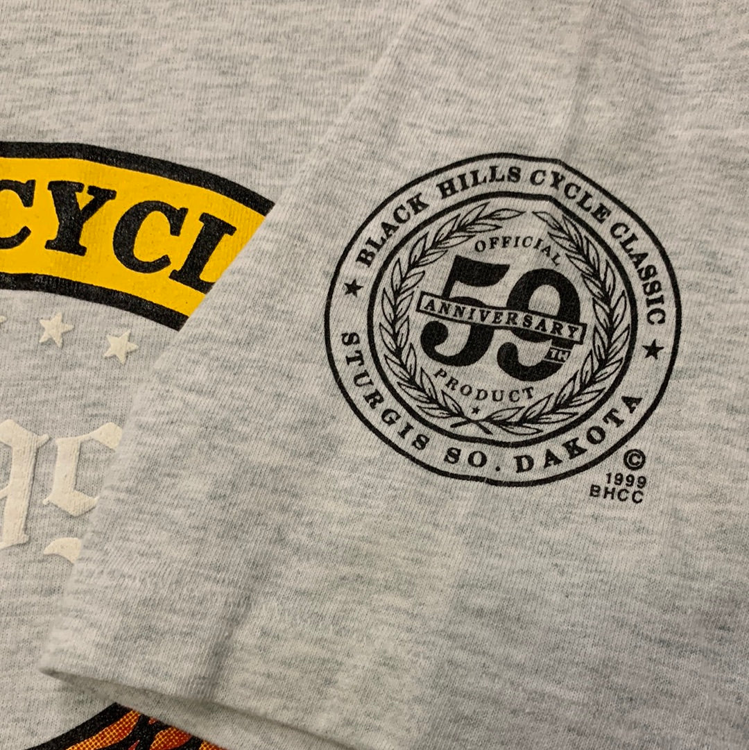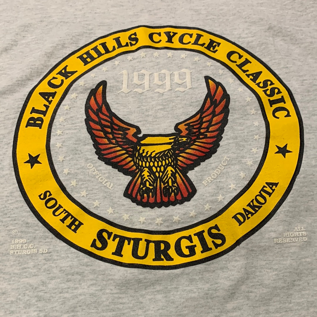 Badass vintage 1999 Sturgis Rally tee. Copyright 1999 B.H.C.C Sturgis SD graphics on the front, sleeve, and back. An officially licensed product. Unisex fit. Single stitch.