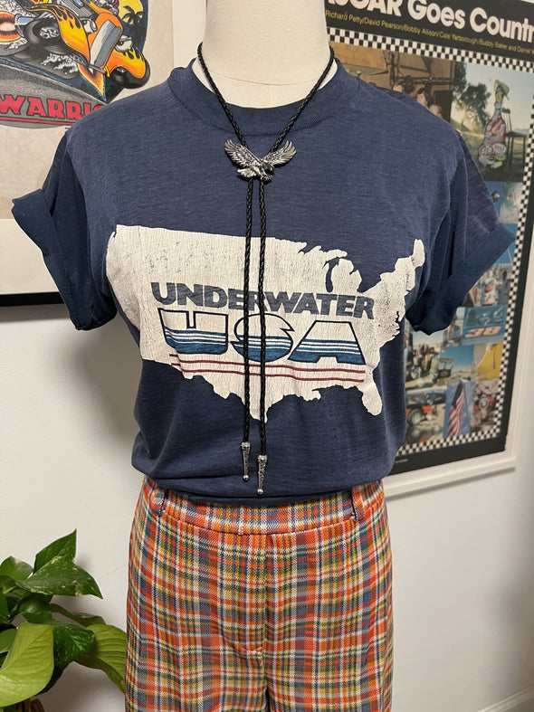 Super soft and worn in vintage 80's Underwater USA tee. Underwater USA graphics on the front. Blank back. Unisex fit. Single stitch.