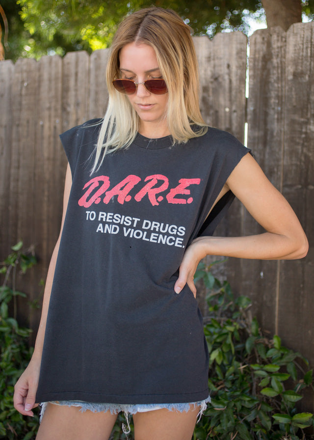 Nicely worn in and grungey, 90's DARE muscle tank. Distressed graphic and areas of bleached stains, giving it a lived it feel. Raw sleeve edge