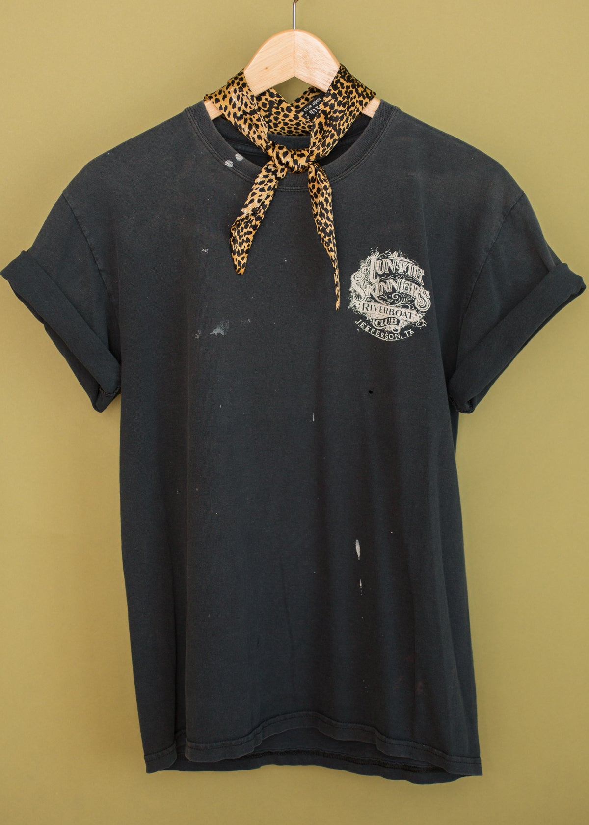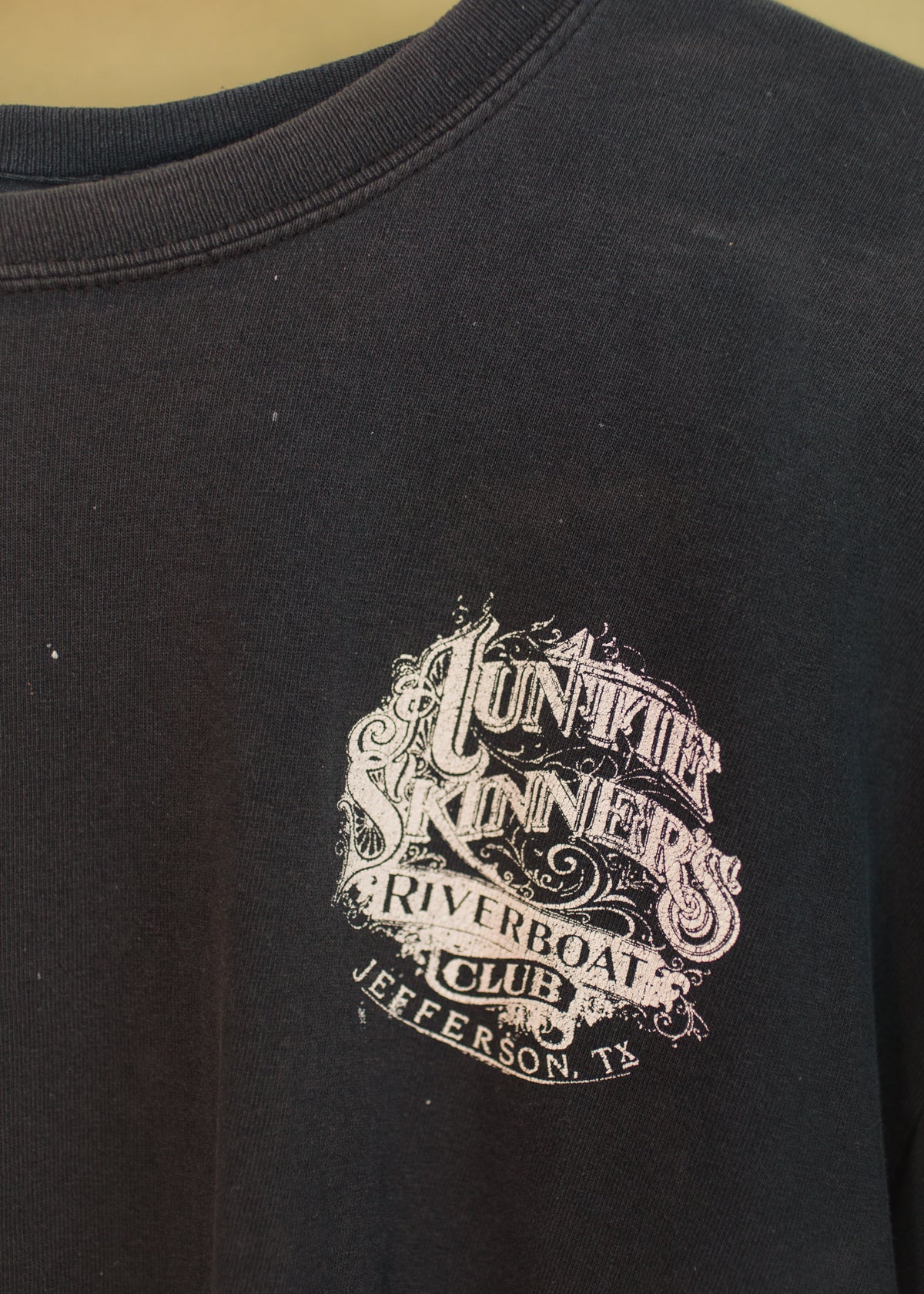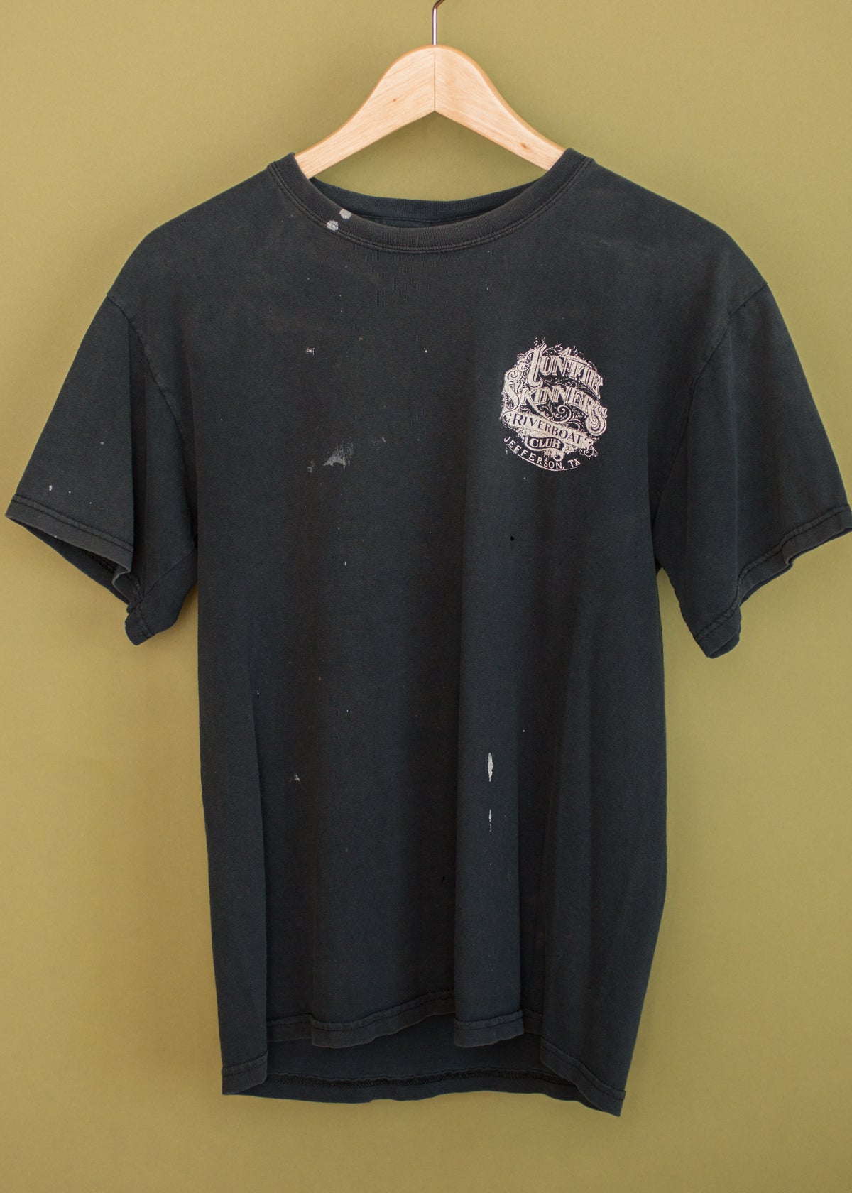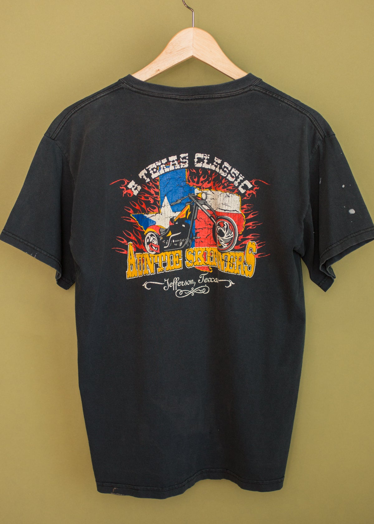 Vintage late '90s grungy Auntie Skinner's Riverboat Cub tee from Jefferson, Texas. Perfectly worn in faded black tee with awesome chest detail design. Paint markings and holes in all the right places. Awesome Texas flag and bike design with "A Texas Classic" on back. Unisex fit.