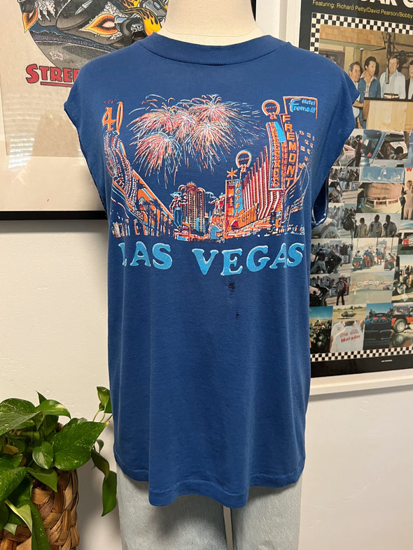 Buttery soft and paper thin vintage 1980's Las Vegas tank. Super rad old vegas/ Fremont street graphic. Raw cut sleeve edges. Unisex fit. Blank back. A couple of runs on the front from fabric thinning and on back side towards bottom hem.
